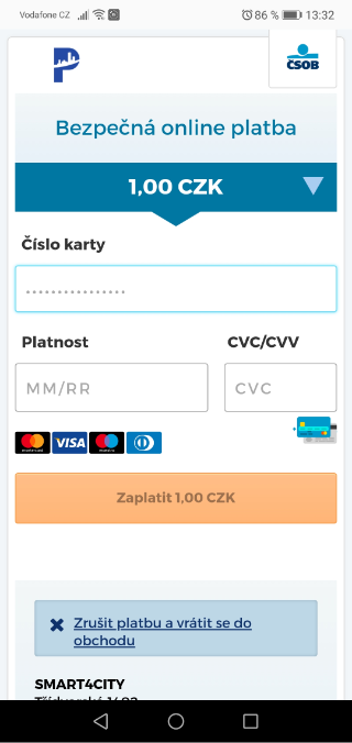 Aplikaci je třeba propojit s Vaší platební kartou. Abychom mohli ověřit, že se jedná skutečně o Vaší kartu, poprosíme Vás o zaslání 1 Kč jako testovací platbu.